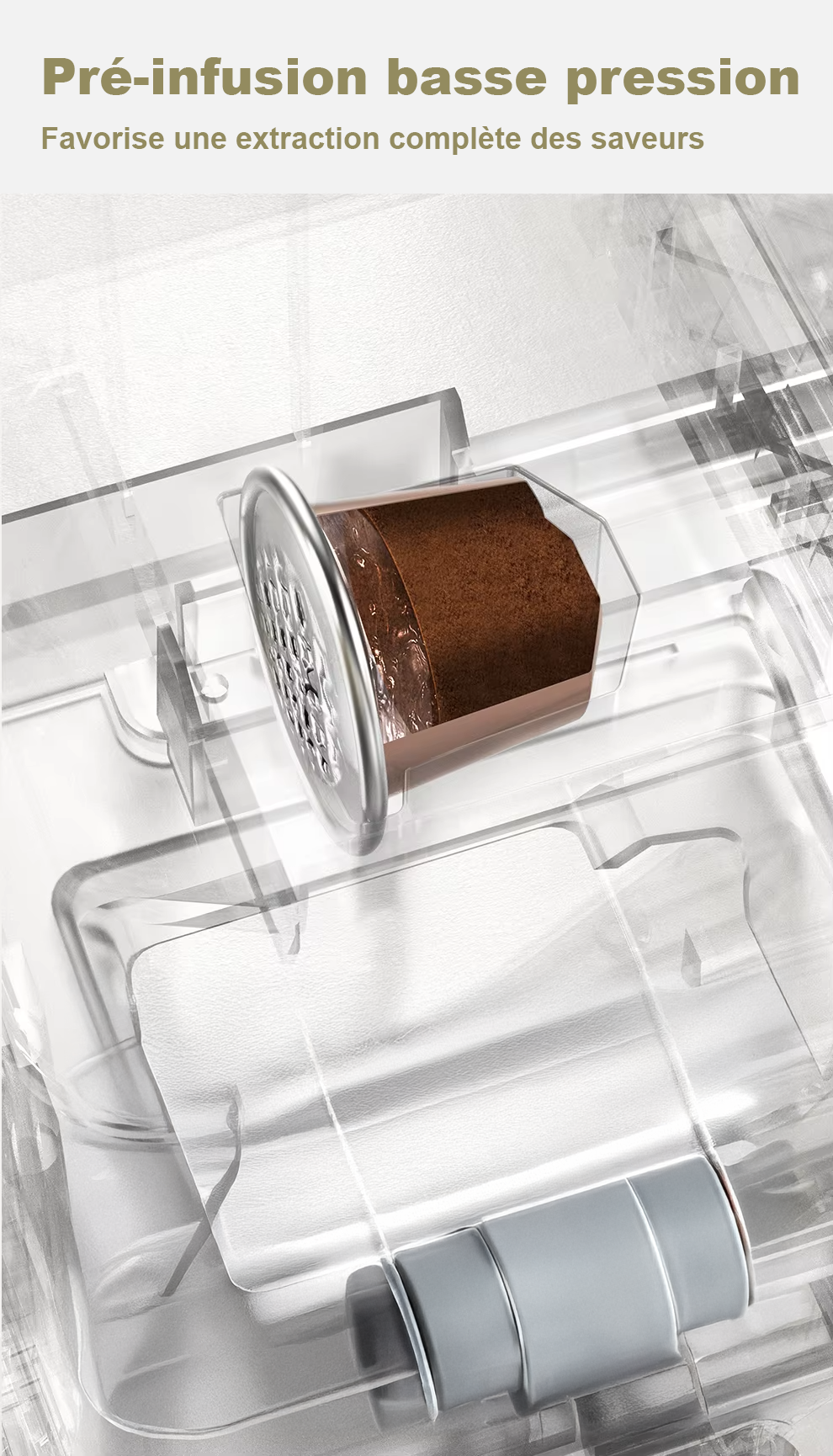 La technologie de pré-infusion à basse pression humidifie uniformément la capsule avant extraction. Ce processus délicat optimise la diffusion de l'eau à travers le café, libérant toutes les subtilités aromatiques pour une tasse d'exception.