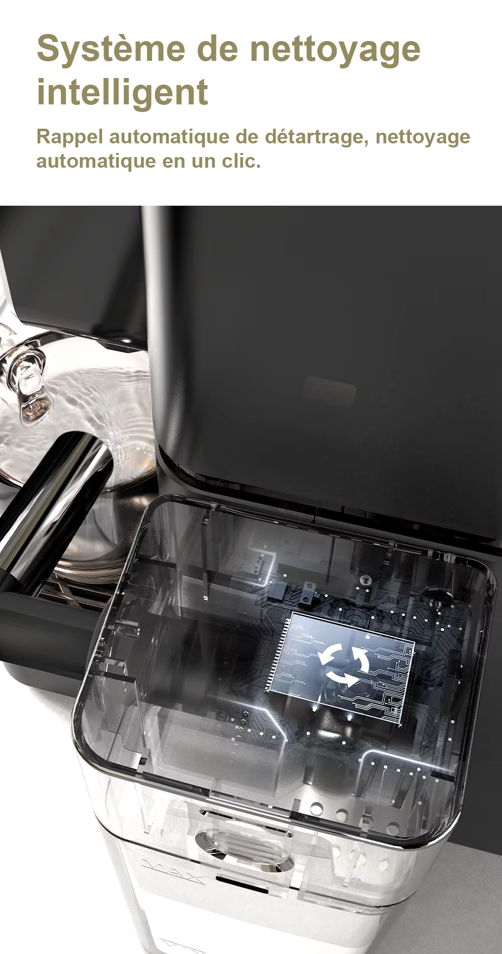 Le système intelligent gère automatiquement les cycles d'entretien avec alertes de détartrage et programme de nettoyage intégré. Cette maintenance automatisée préserve la qualité d'extraction et prolonge la durée de vie de votre machine.
